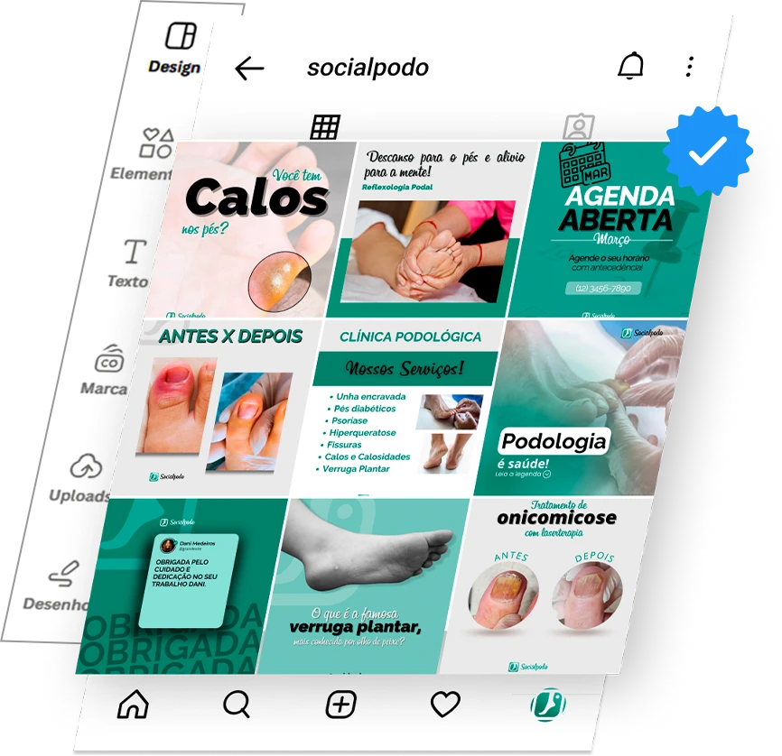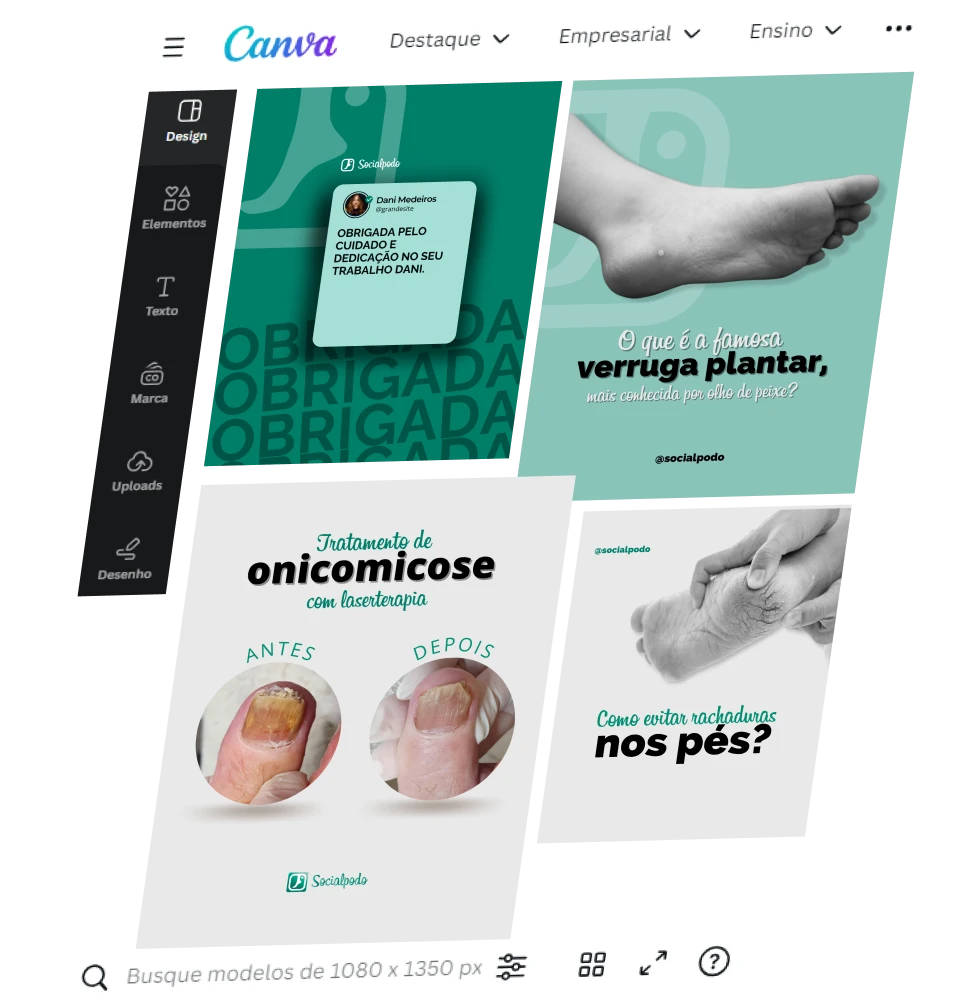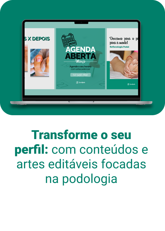 Com acesso a conteúdos estratégicos para a podologia e artes fáceis de editar, você economiza tempo e consegue aparecer para seus potenciais pacientes.